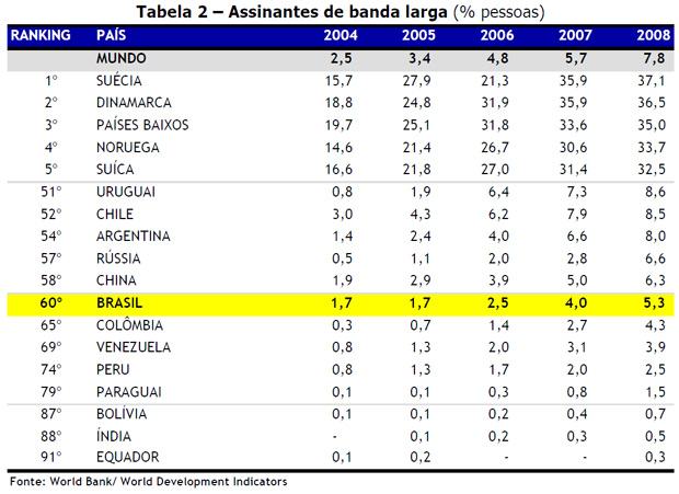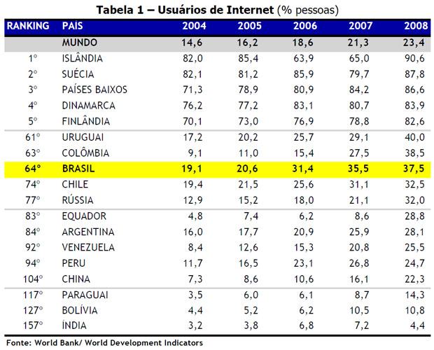 Um estudo feito pelo Banco Mundial indica que apesar de estar acima da média mundial que é de 23,4% em acesso à internet o Brasil com cerca de 37,5% precisa e deve melhorar muito para se aproximar um pouco dos líderes mundiais que em alguns casos chegam até a 90,6% da população online.