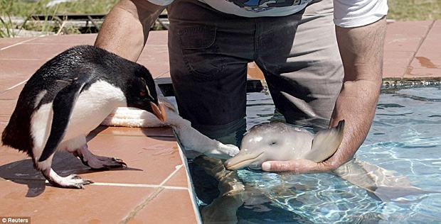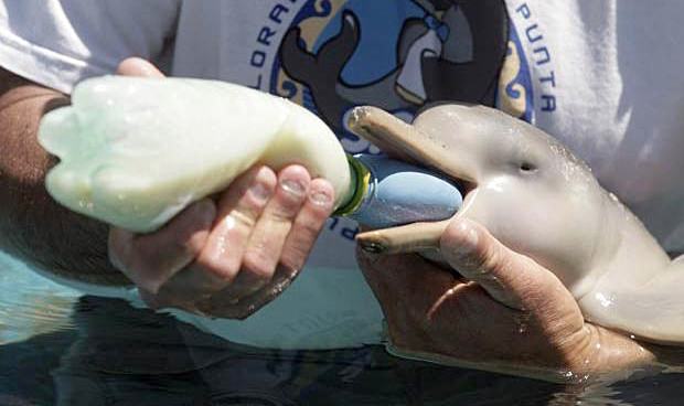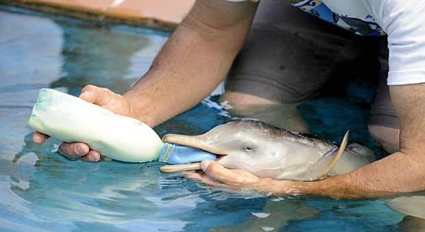 Bebê Golfinho amamentado por homem