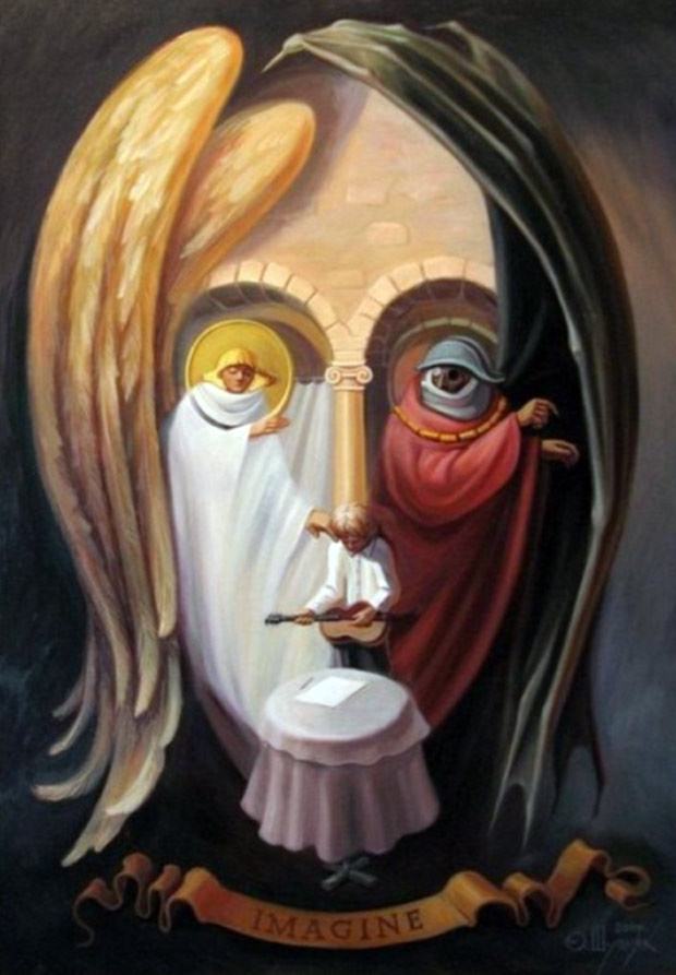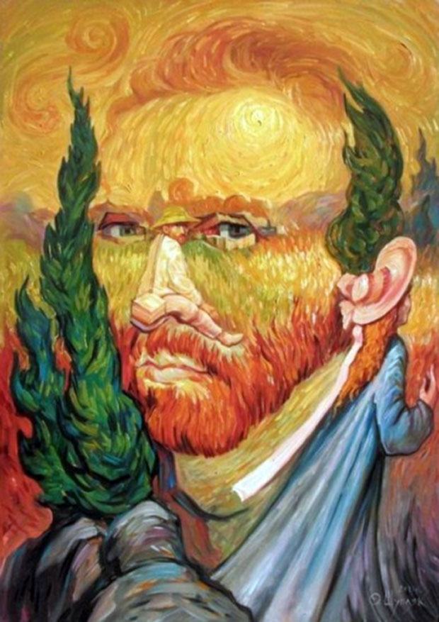 Artistas famosos, figuras culturais e personagens como John Lennon, Pablo Picasso, Sigmund Freud, Charles Darwin, Paul Gauguin, Zeus e Tio Sam estão na lista do ilusionista Shuplyak.
