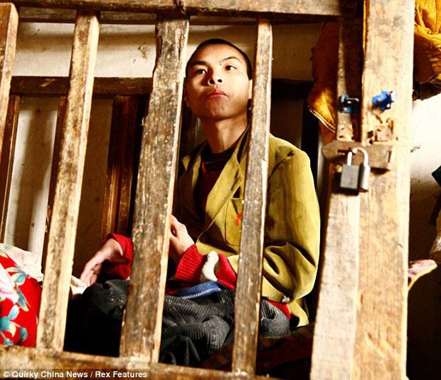 Estas horríveis imagens relatam o destino de um menino chinês forçado a passar todos os dias de sua vida preso em uma gaiola de madeira.